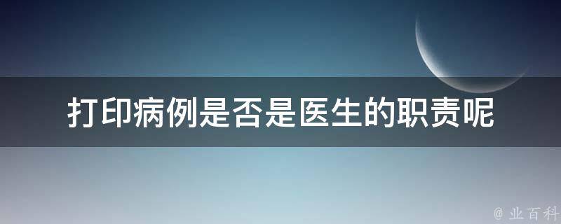 打印病例不是医生的职责。根据医院规章制度及科室规章制度,医生主要负责对病人病情的诊疗,而打印病例是病案室的工作职责,由病案室专职人员负责。病案室工作人员负责全院的病案管理,包括对病案的回收、装订、编码、归档、上架、病案查询、复印,为外来办案人员、参保人员、临床科研等提供可靠资料,同时进行病案质量控制,提高病案书写水平。