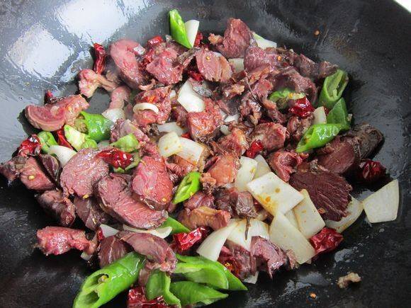 6、热锅凉油加花椒粒辣皮子小火炒出香味。