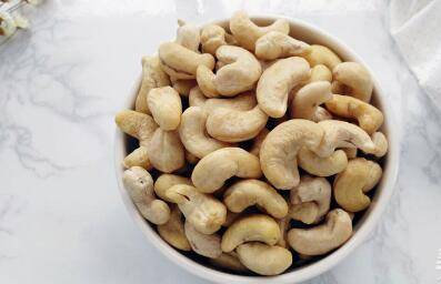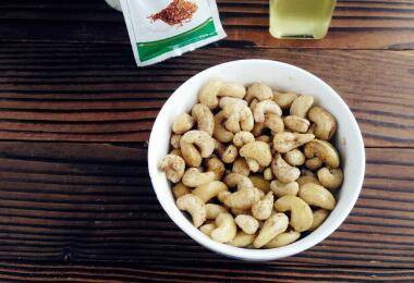 将适量的色拉油、椒盐加入到腰果中,并拌匀。