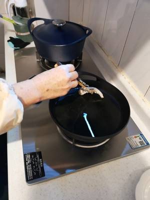 5、定型后再翻面,小火慢炸至两面金黄即可。