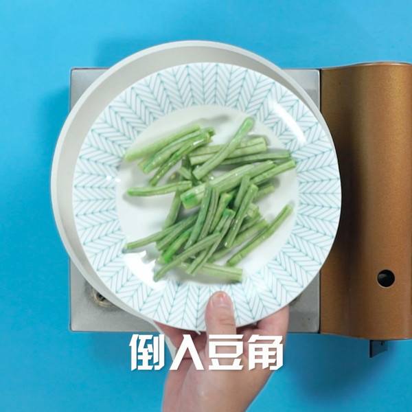 4、倒入豆角,放入豆瓣酱、生抽、白砂糖、盐,鸡粉,翻炒均匀,倒入辣椒即可出锅。