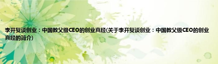 大家好,李开复谈创业:中国教父级CEO的创业真经,关于李开复谈创业:中国教父级CEO的创业真经的简介很多人还不知道,现在让我们一起来看看吧!